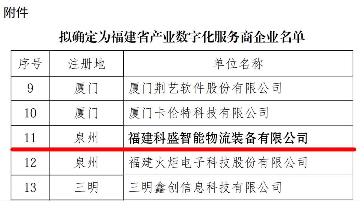 福建科盛智能物流装备有限公司作为国家级高新技术企业、国家级专精特新 “小巨人” 企业,深耕智能仓储、物流分拣包装及数字工厂自动化领域,此次成功入选福建省产业数字化服务商,是福建省工信厅对科盛智能数字化服务能力的权威认可,更是企业在产业数字化领域深耕的实力见证。未来,福建科盛智能物流装备有限公司将充分发挥技术与行业优势,依托省级服务商平台,积极参与福建省产业数字化转型项目,为企业提供物流数字化解决方案,助力福建省制造业智能化升级,为企业智能化升级提供优质、专业的数字化服务支撑。